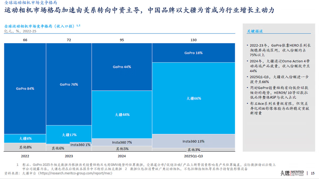 据久谦咨询报告,大疆创新已成为全球运动相机领域的领导者,预计到2025年第三季度将占据66%的市场份额。这与2022年GoPro占据84%市场份额的局面相比,可谓发生了重大转变。